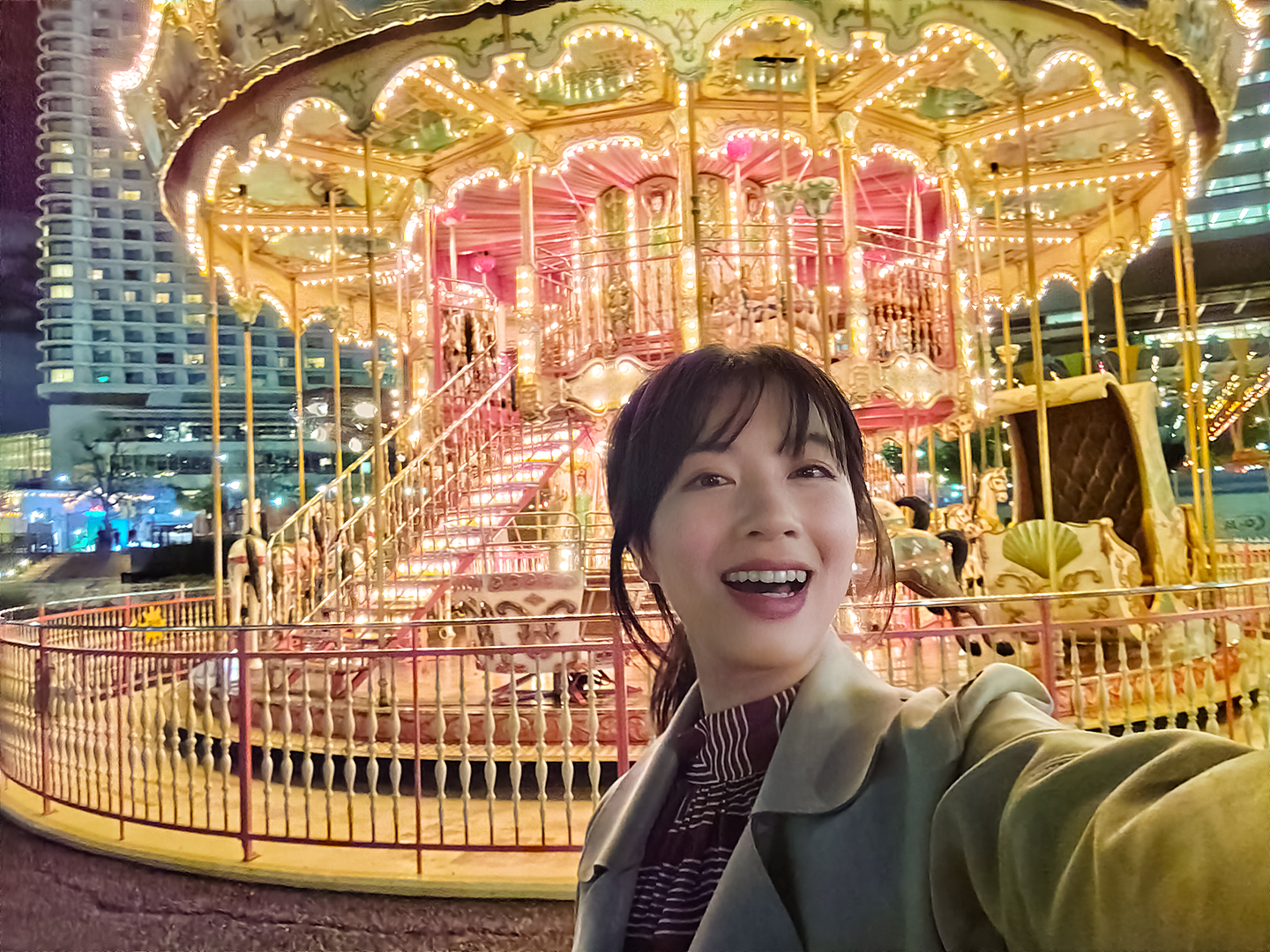 Selfies at night with illuminations in the background are also beautiful.