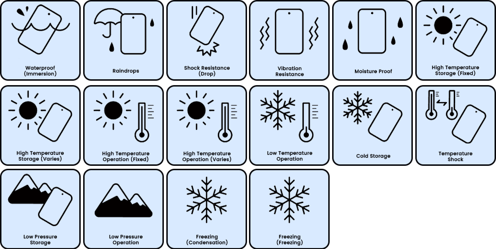 - Shockproof (drop): Test of dropping the product in 26 directions from a height of 1.22m onto lauan wood