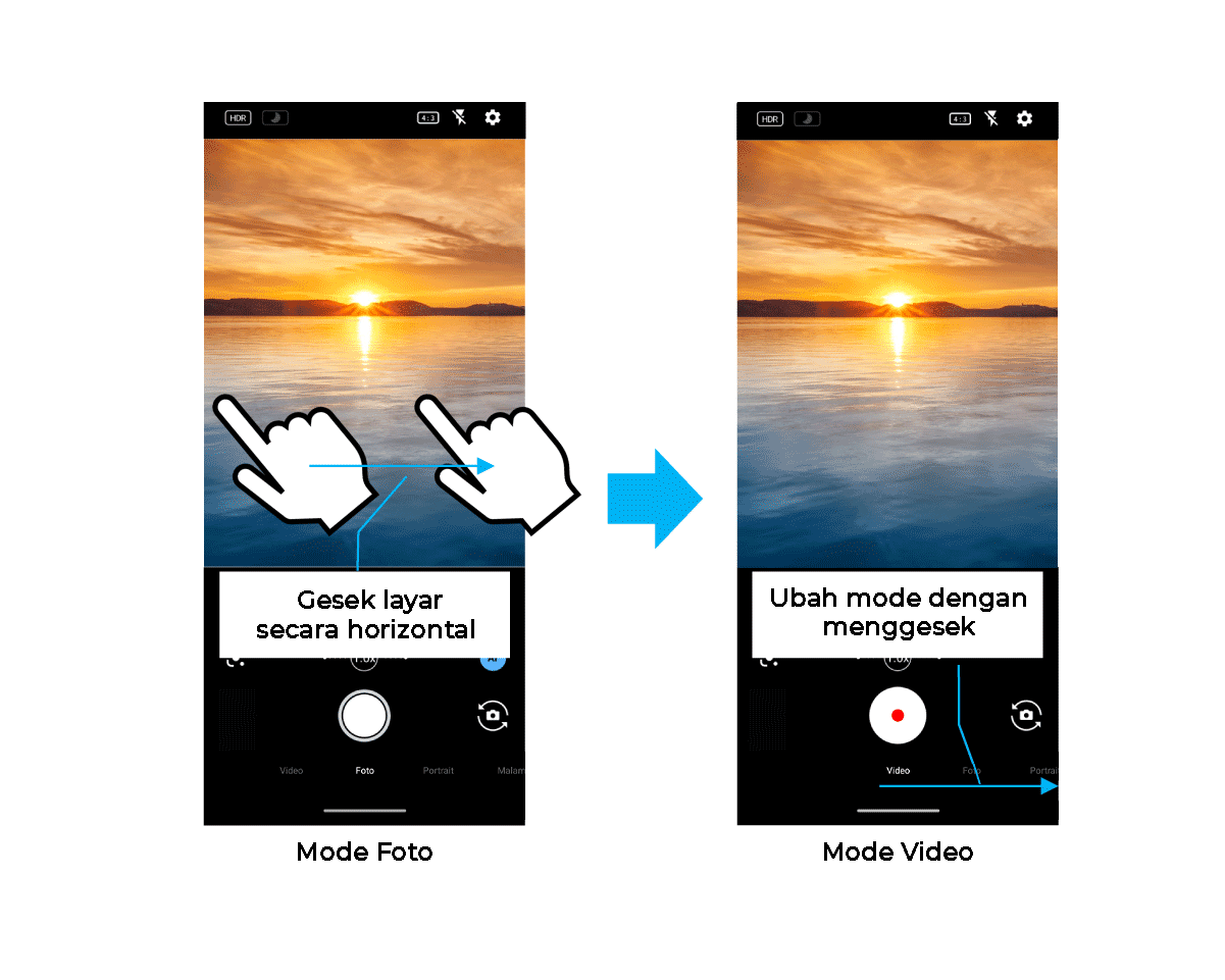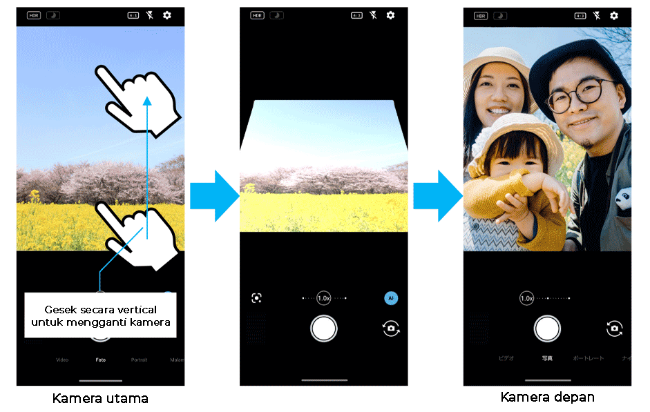 - ・Beralih antara kamera depan dan kamera belakang dengan menggesek layar secara vertikal