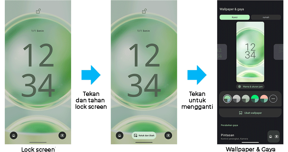 - *Untuk mengubah font, pilih Pengaturan → Wallpaper & gaya → Kunci Layar dan geser layar ke kiri atau kanan.