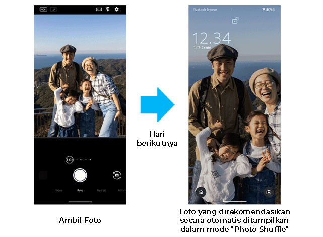 Untuk menggunakan fitur ini, pilih Pengaturan → Trik AQUOS → Lock Home Photo Shuffle → Foto dipilih dari foto terbaru. - *Sudah didukung oleh AQUOS sense8.