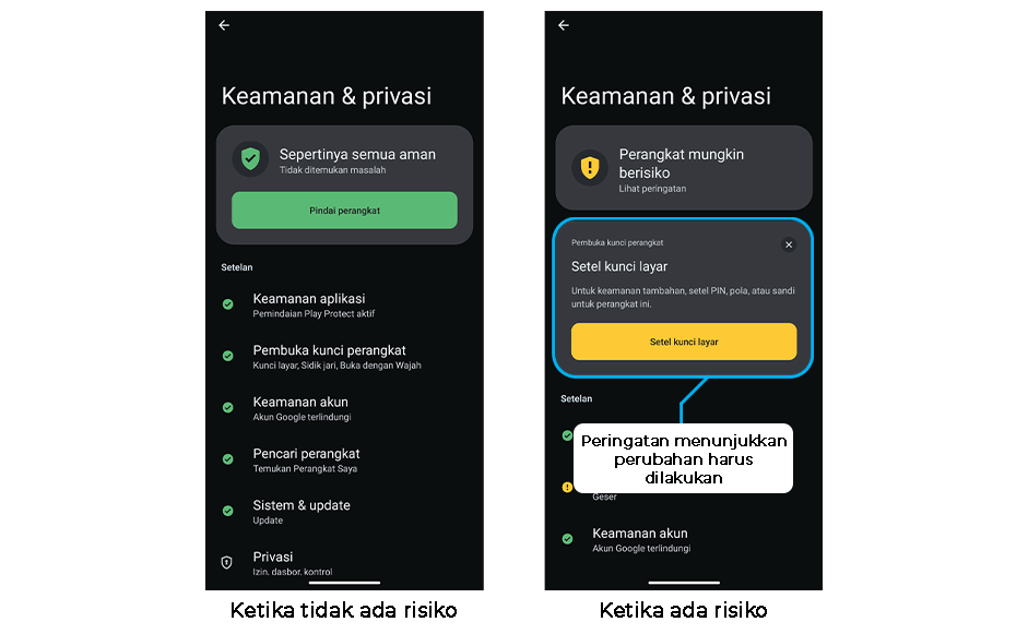 Pembaruan keamanan versi terbaru Android, dapat menunjukkan status keamanan & privasi.