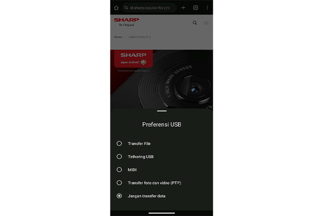 Saat Anda menyambungkan kabel USB ke PC atau perangkat lain, pop-up pengaturan koneksi USB muncul dengan mode layar penuh.