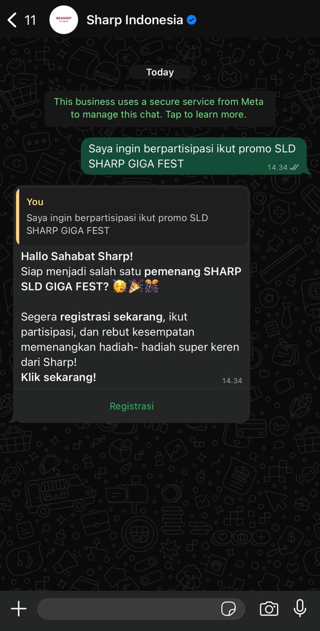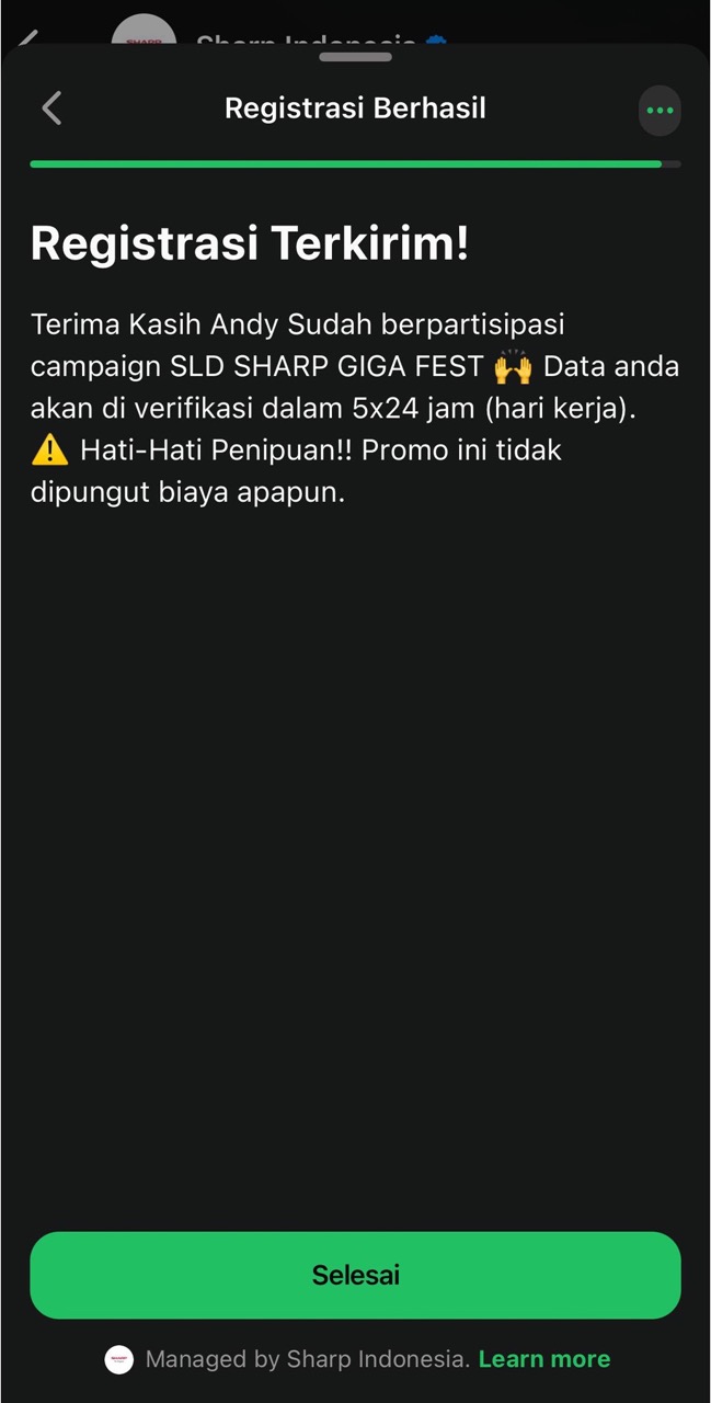 A: Pastikan data yang Anda registrasikan telah diisi dengan benar dan lengkap. Dan cek kembali inbox Whatsapp dari SHARP - Q: Apa yang harus saya lakukan jika setelah registrasi produk muncul notifikasi "Mohon maaf! Data Pembelian Anda telah divalidasi dan belum memenuhi syarat. Silakan melakukan registrasi ulang"?