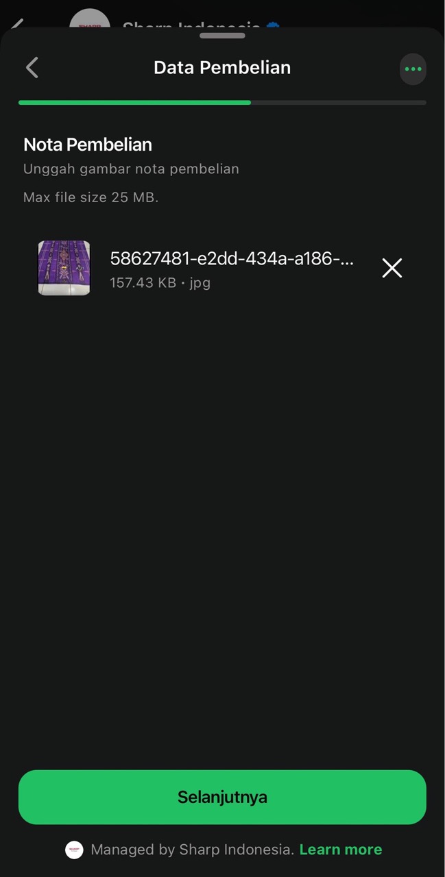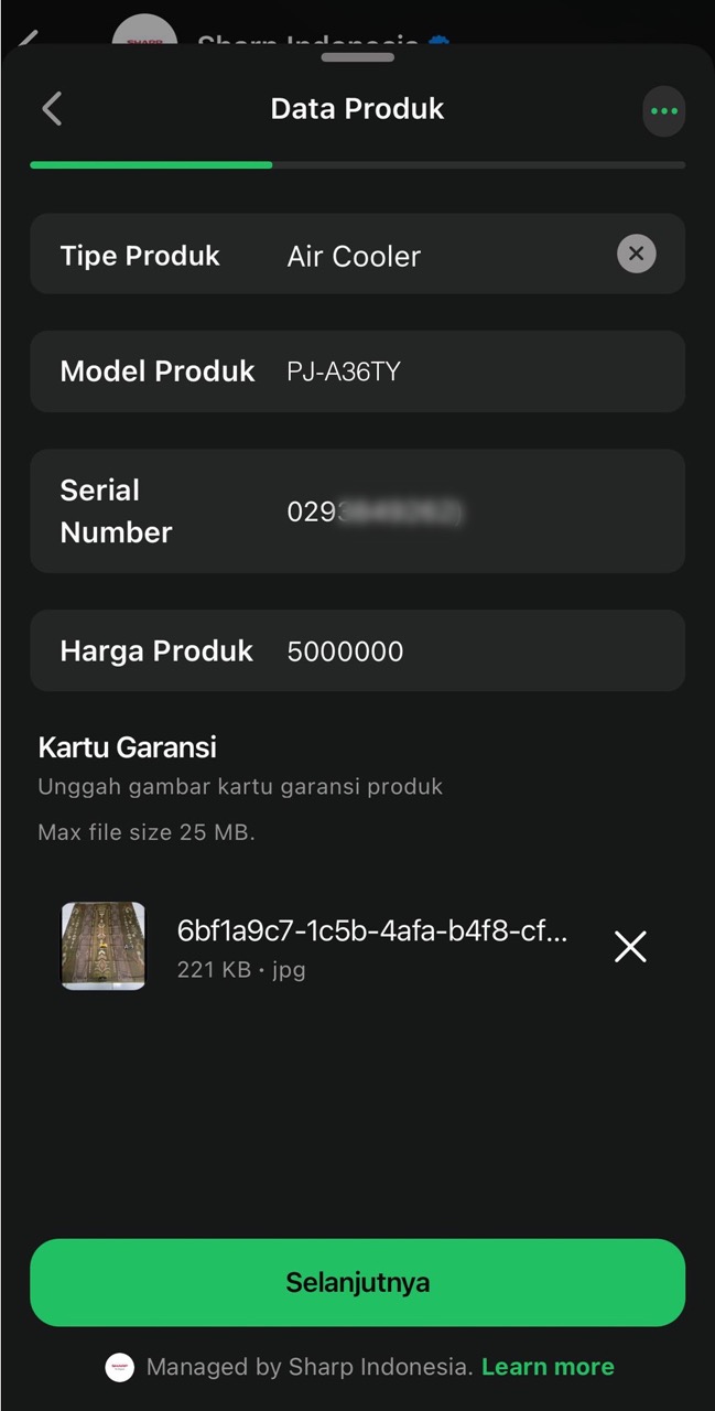 A: Silakan lakukan registrasi ulang dengan melampirkan foto nota pembelian dan kartu garansi yang jelas (tidak buram). Pastikan nama dan nomor telepon yang tertera pada nota, kartu garansi, dan akun registrasi sesuai dan konsisten. Serta pastikan pengisian kartu garansi tidak menggunakan pensil. - Q: Bagaimana jika saya membeli produk SHARP di toko yang notanya tidak mencantumkan nama saya?