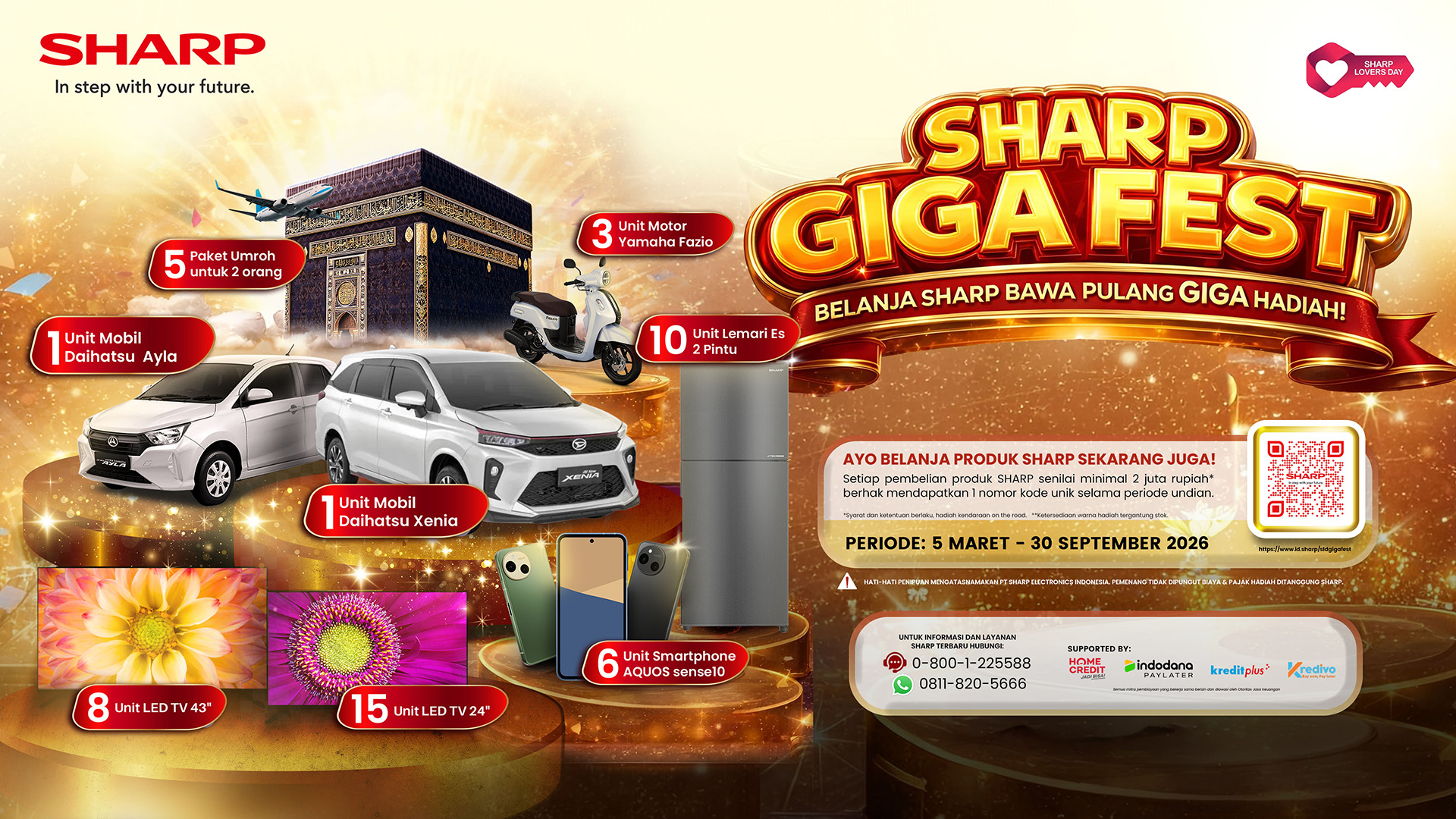 Tahun ini, perayaan dikemas lebih besar, lebih panjang, dan lebih bernilai. Mengusung tema “Belanja SHARP Bawa Pulang GIGA Hadiah”, program berlangsung selama tujuh bulan, mulai 5 Maret hingga 30 September 2026. Sebanyak 56 unit hadiah disiapkan sebagai simbol 56 tahun perjalanan Sharp di Tanah Air.